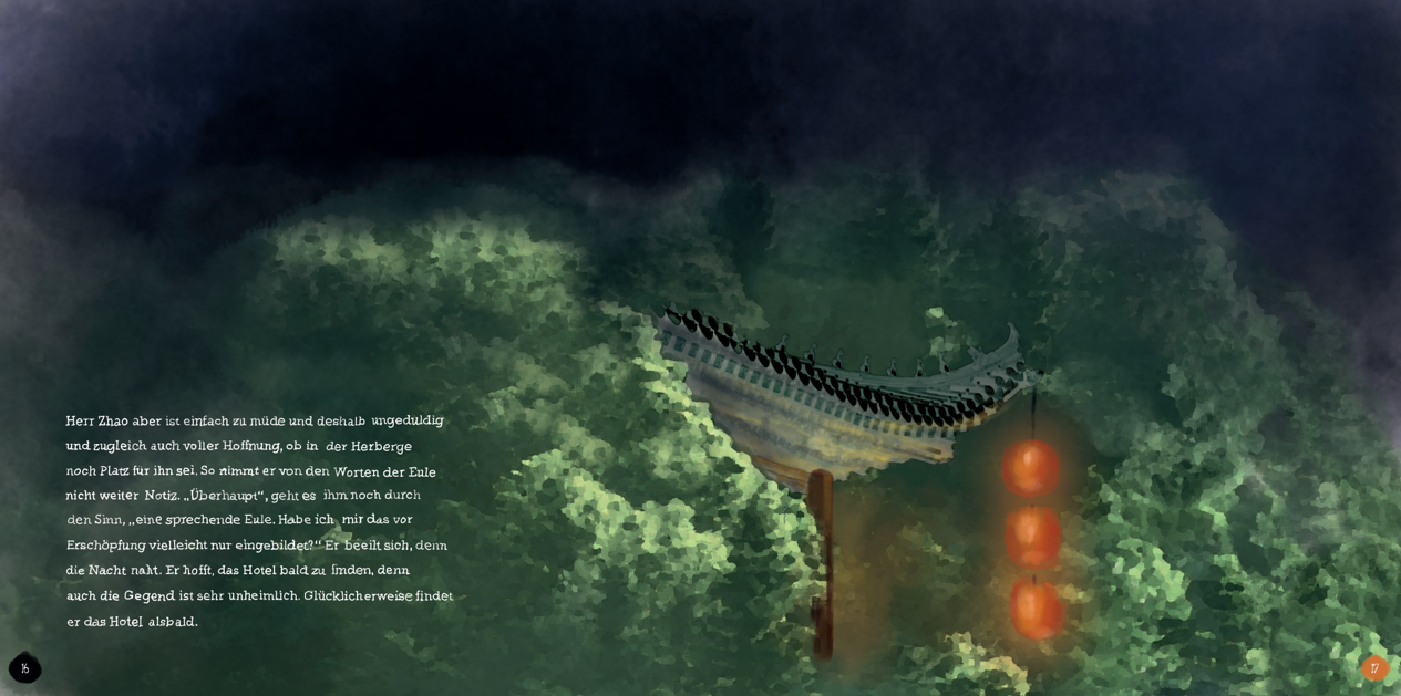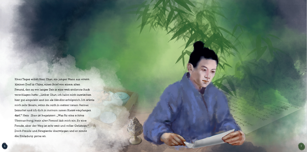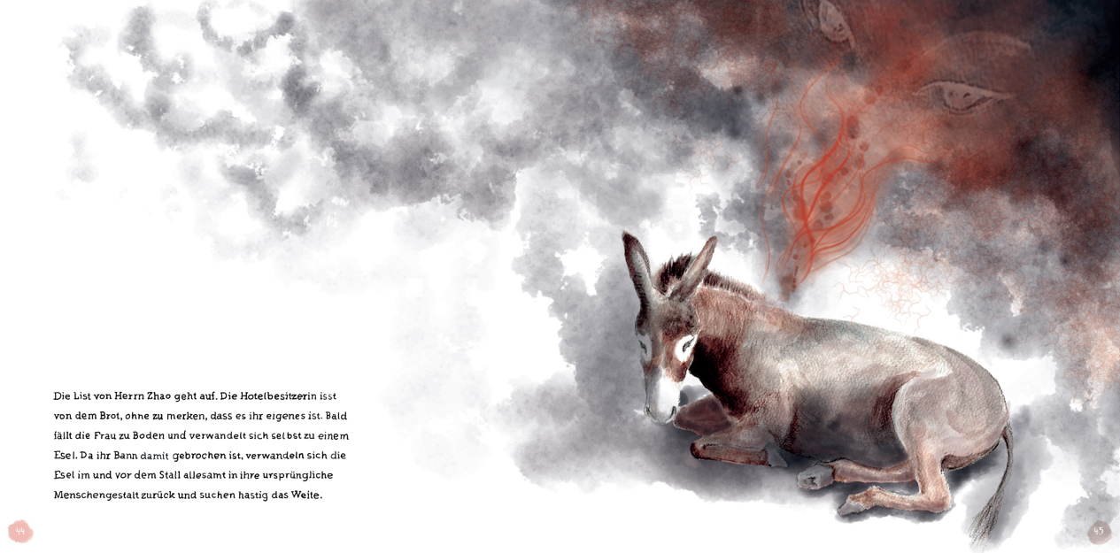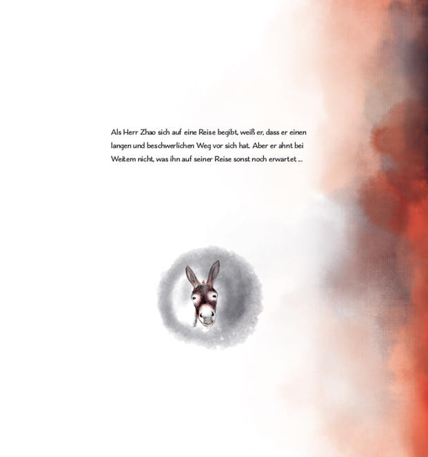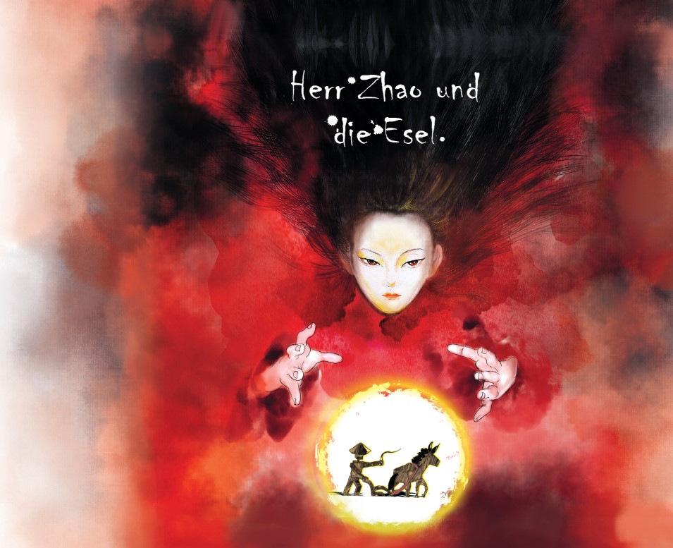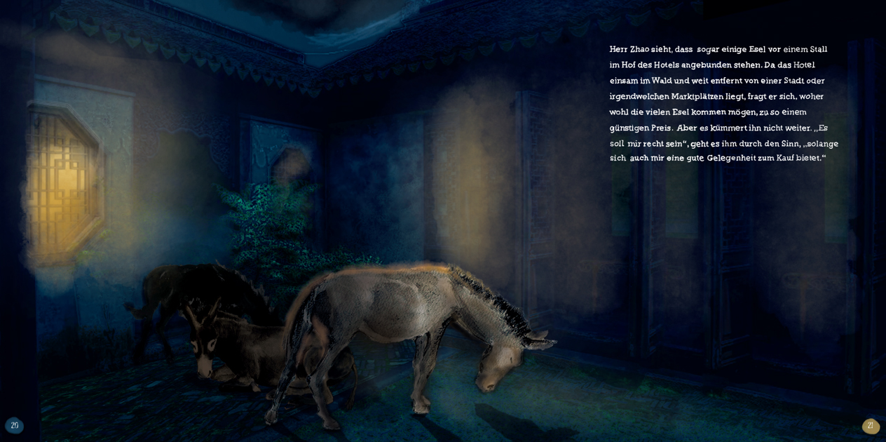 Ausschnitte aus dem Buch "Herr Zhao und die Esel", einem Märchenbuch für alle Altergruppen, auf der Bassis von Tuschzeichnungen mit digitaler Finalisierung und handgefertigter Typografie.