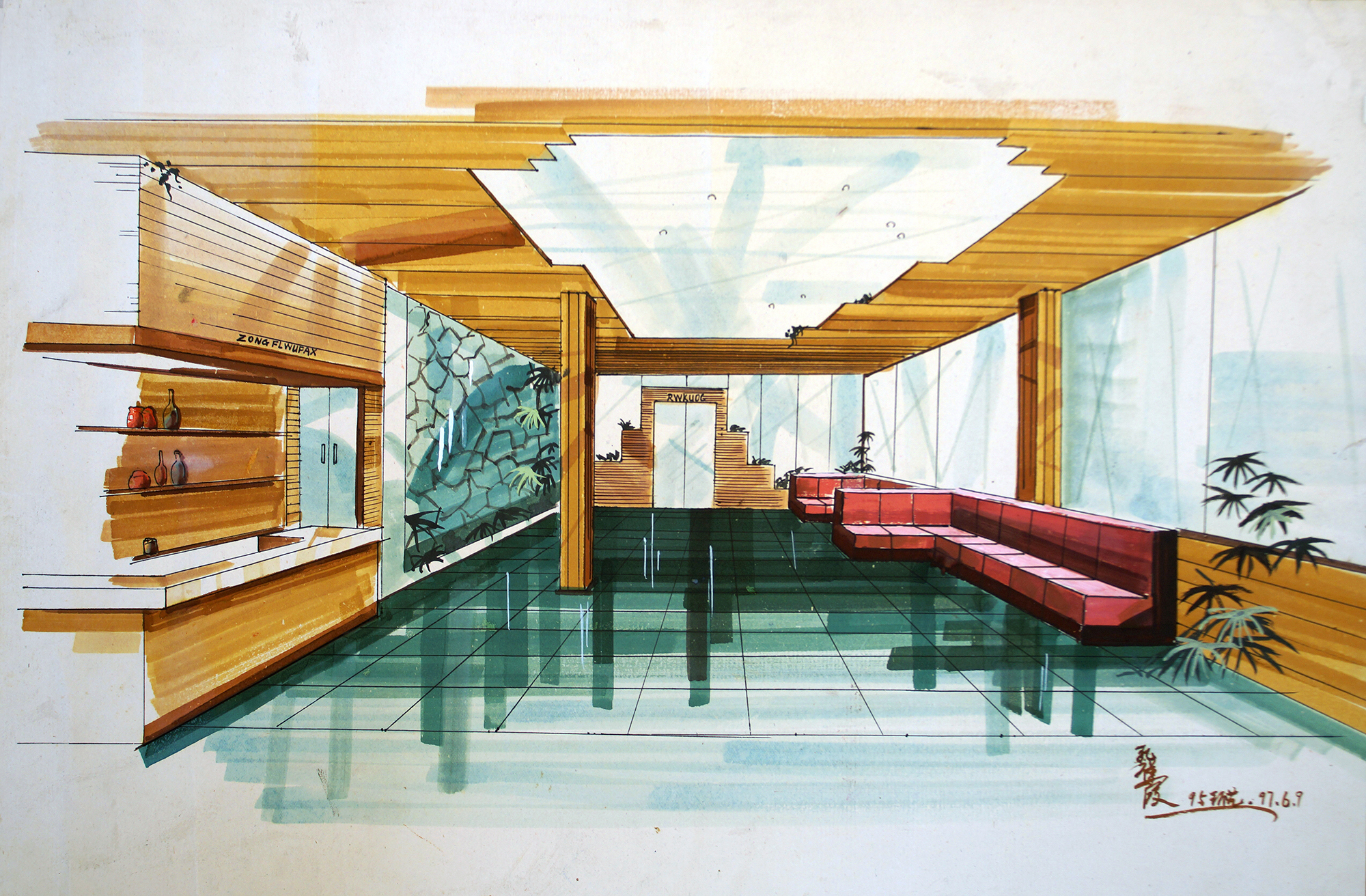 Innenarchitektonische Entwurfszeichnung für den Gestaltungsplan einer Hotellobby
